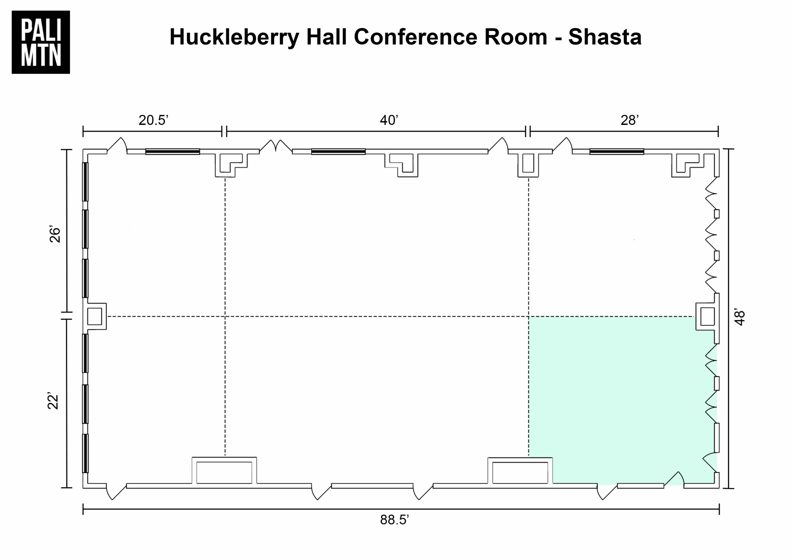 1 of 6 subdivided sections of the Huckleberry Hall Conference Room. It is conveniently located on the second floor of the dining facility. Floor Plan